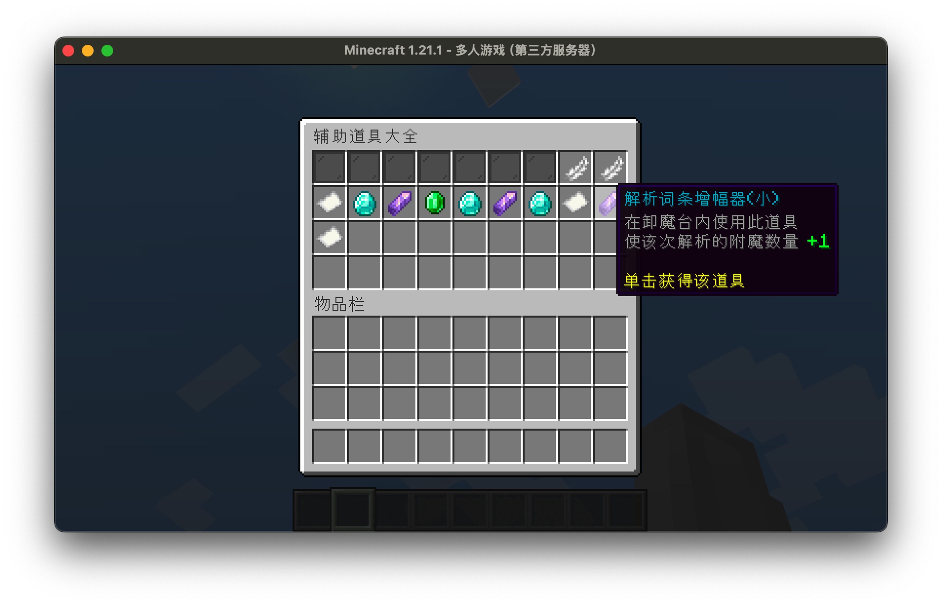 你可以使用该命令为自己或其他玩家打开辅助道具菜单。拥有 chesed.get-gem 权限的玩家可通过点击辅助道具来获得对应道具。